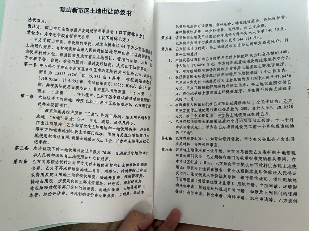 受原琼山市委、市政府委托,原琼山市江东新市区开发建设管理委员会于2002年11月18日与宏华公司签订《土地出让协议书》。本文图片均为 澎湃新闻记者 谢寅宗 图