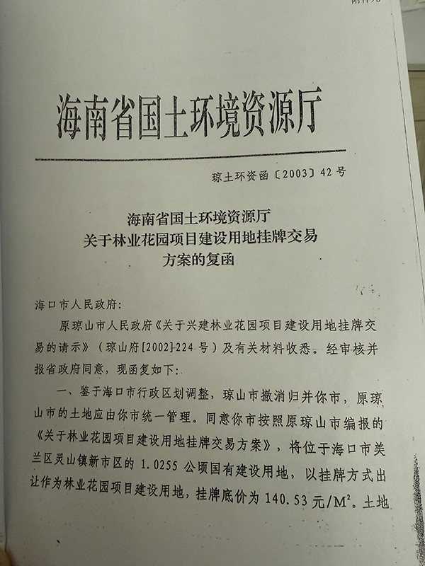 2002年11月19日,原琼山市《市政府常务会议纪要》明确,“林业花园”项目净用地出让价为11.901万元/亩。