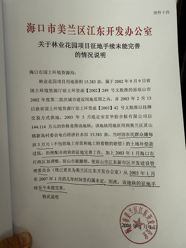 2008年3月3日,美兰区江东开发办公室出具情况说明称,2003年挂牌交易的林业花园项目用地还未完成土地征收工作