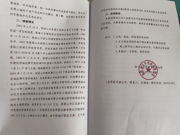 2020年5月6日,海口市资规局核查后认为,宏华公司通过拍卖取得林业花园项目地块的国有土地使用权,让美兰区政府妥善解决