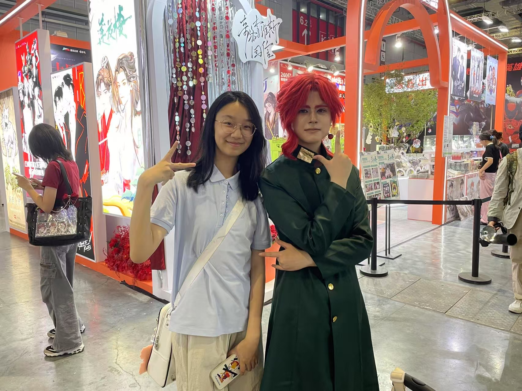 Coser小袁告诉记者,自己扮演的是番剧《JoJo的奇妙冒险》中的角色花京院典明,今天是与好友一起从浦东打车过来的。“我很喜欢这个角色,为了出这次的Cos筹备了两周时间,希望今天能找到扮演同一部作品里角色的人一起拍照。”小袁说,自己与一旁的好友小韩都是准高一,她们刚刚结束中考,已经在家宅了有些时候了,这次打算出来好好放松一下。