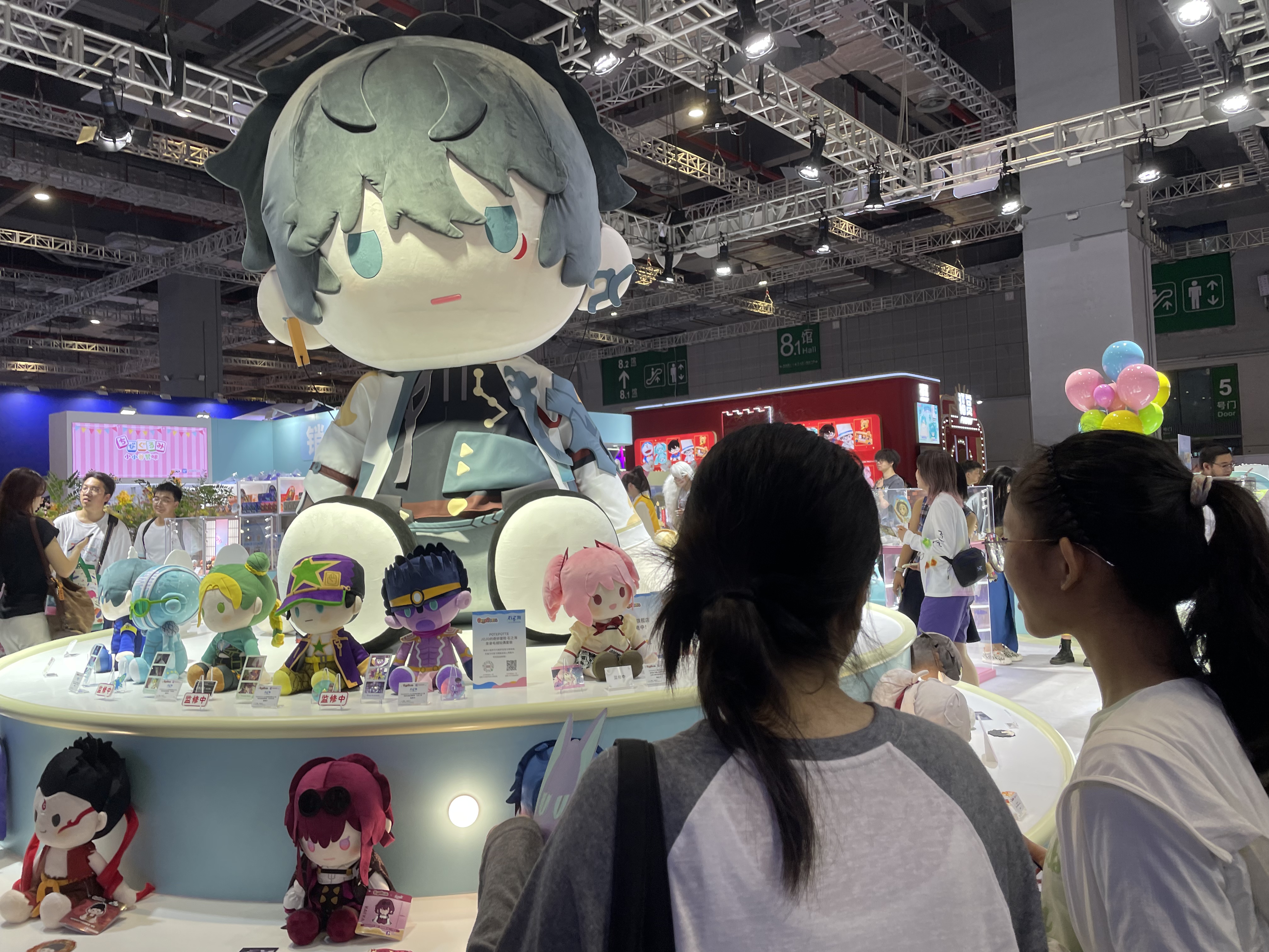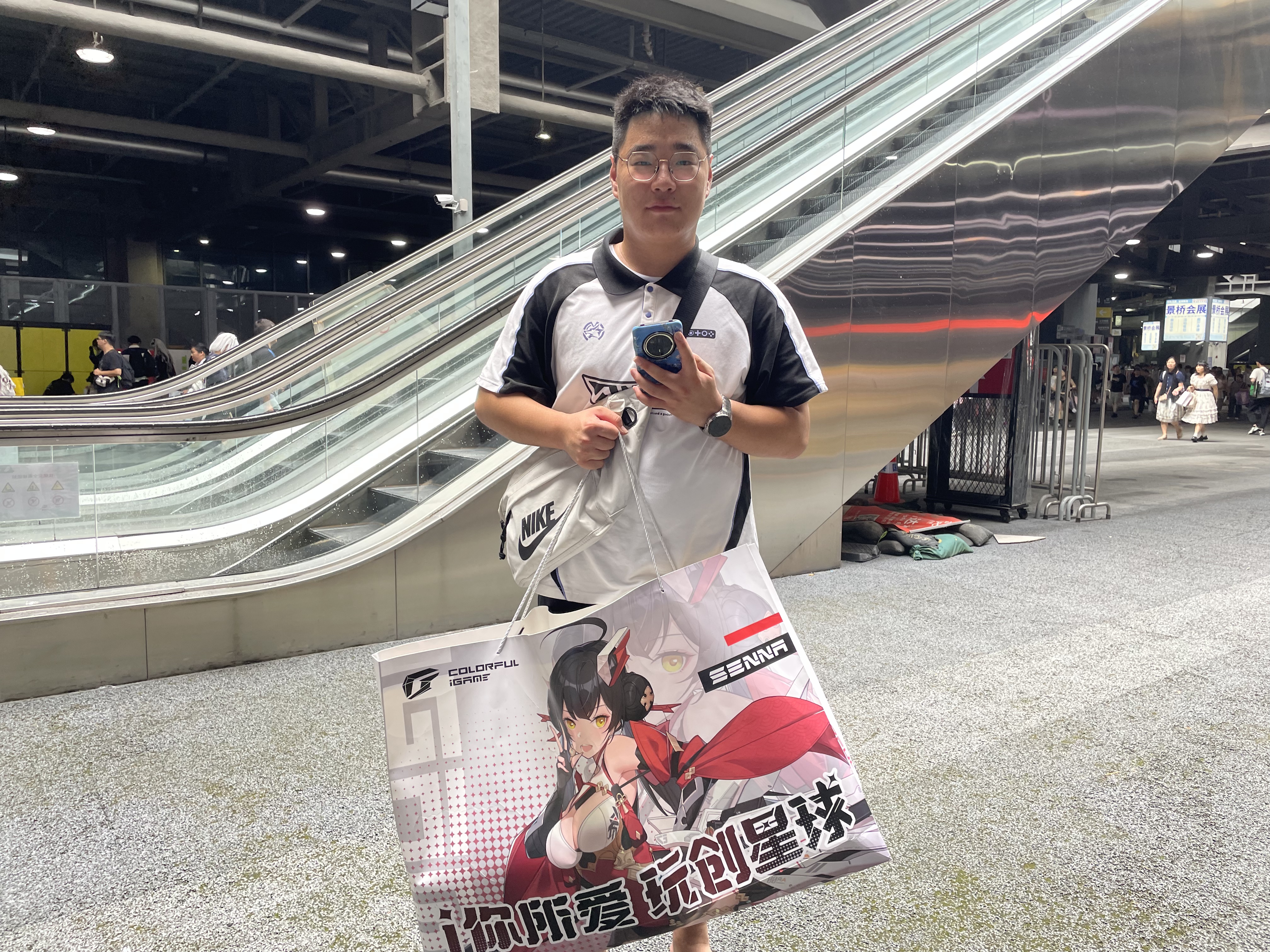 一直到下午两点左右,仍有推着行李箱、身着“C服”或“痛衣”的人从各个入口陆续入场。在游戏、模玩等一些热门展区,观众、coser、玩家、摄影爱好者摩肩接踵,手中都拎着大大小小的礼品袋。