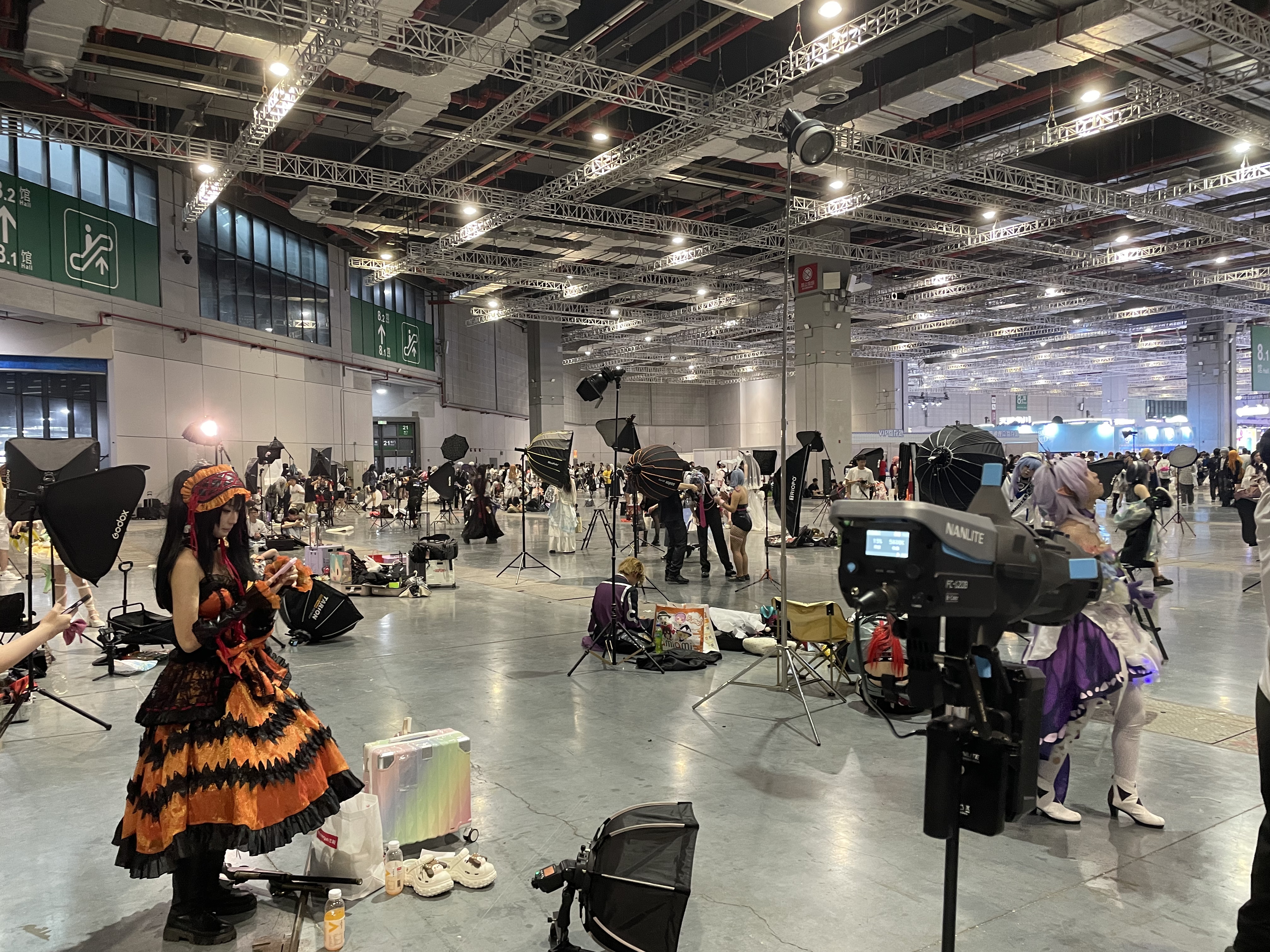 而在各大IP展区之外,“四叶草”各处还散布着一些摄影集聚地。记者在8.1馆看到,有一片空地被数十根长短、尺寸各异的摄像机支架和补光灯架占据,这些设备有条不紊地间隔摆放,俨然“摄影棚”的架势。一些coser站立其间,在摄像师的指导下不断变换着姿势,想要定格最美的瞬间。