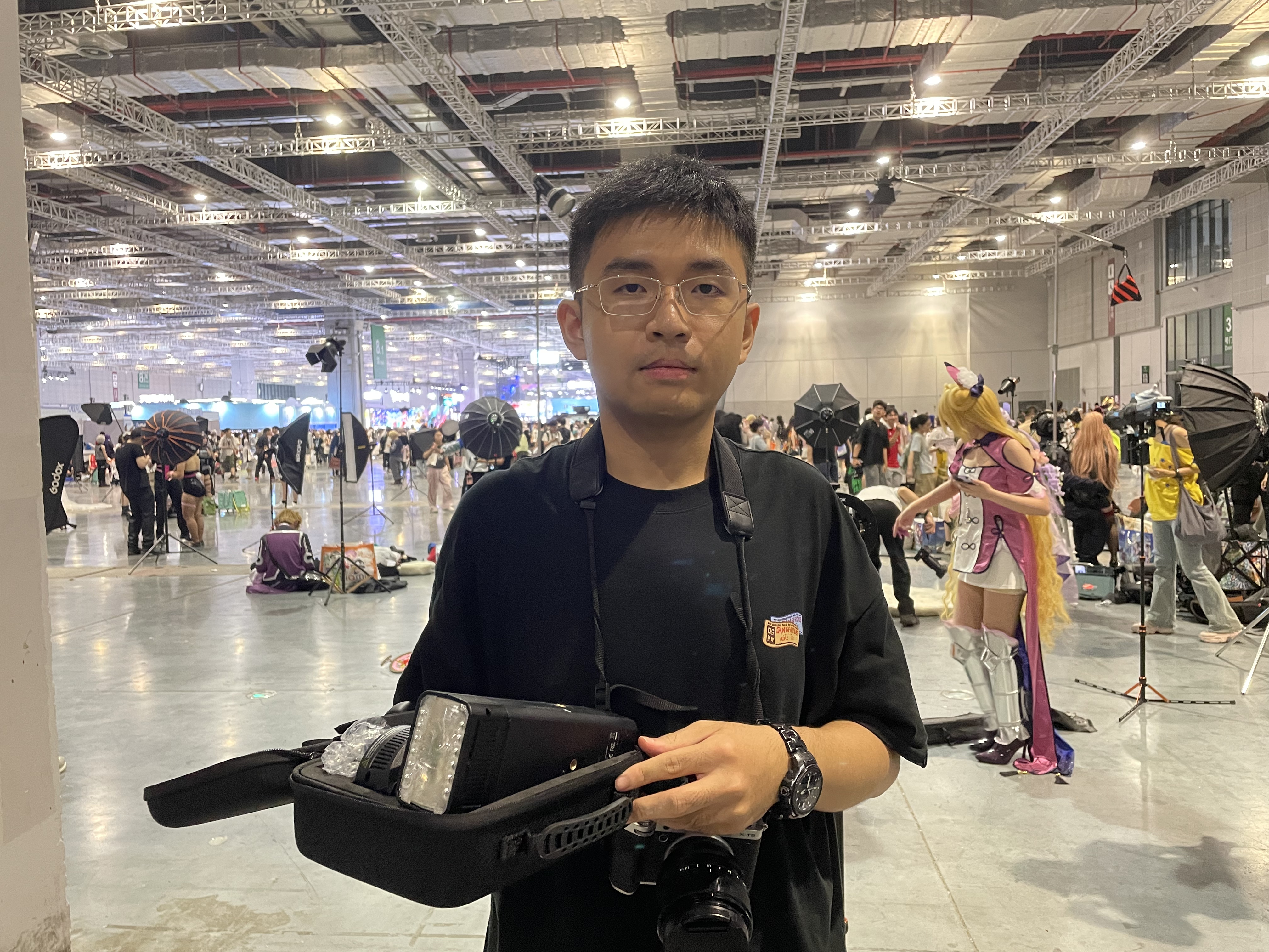 正在收拾相机设备的大二学生小陈从2017年第一届BW起就几乎每年都来拍摄。“最开始是纯抱着玩的心态来的,就是看到喜欢的角色就帮对方拍照然后返图,是属于‘为爱发电’。”他说,“现在我一般会上午接点单为coser拍‘场照’,赚回门票钱,然后下午就收摊自己去逛一下。”